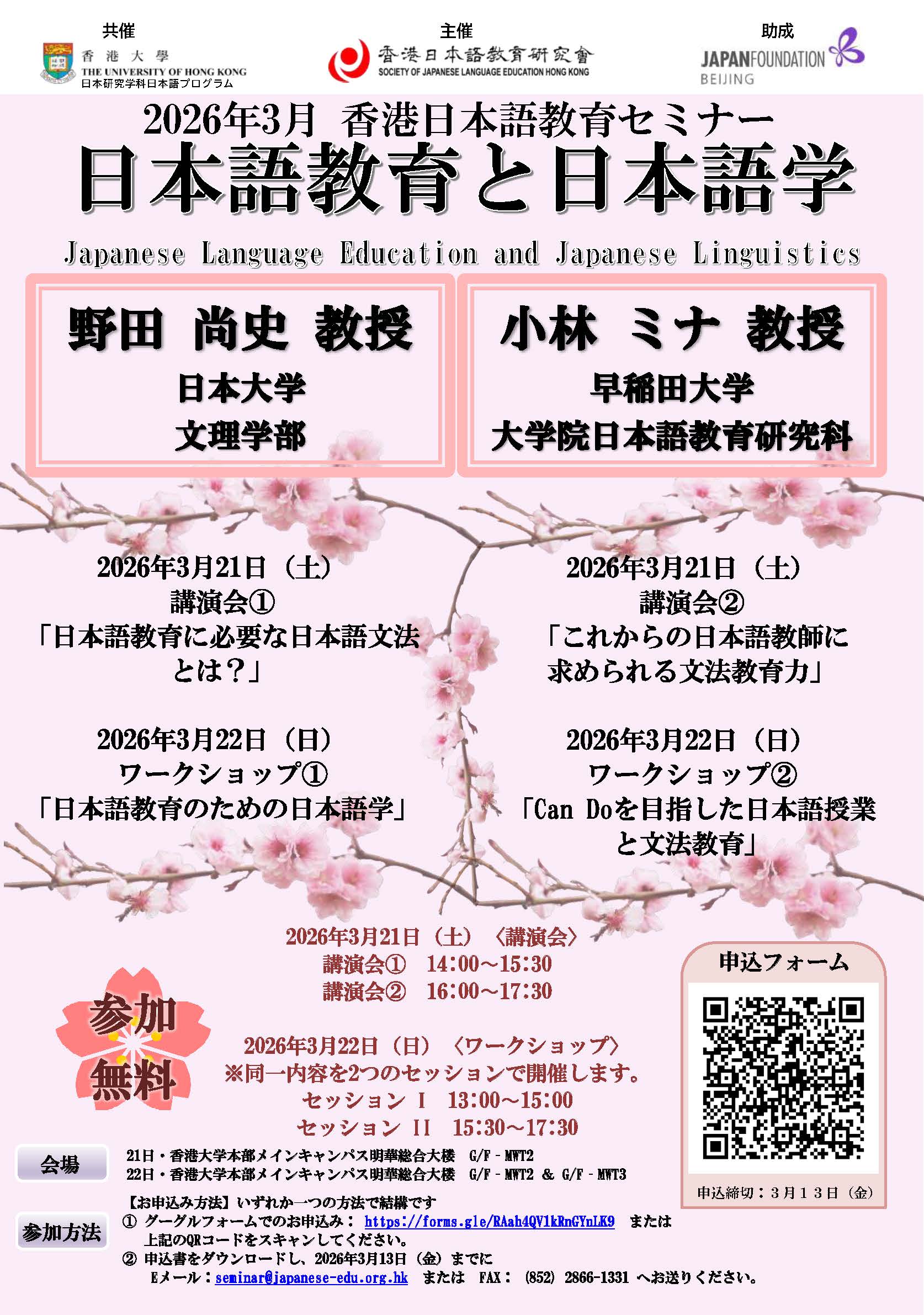 主催: 香港日本語教育研究会 共催: 香港大学 日本研究学科日本語プログラム 助成: 国際交流基金 JFにほんごネットワーク (通称:さくらネットワーク) 講演会 日時: 2025年3月21日(土) 午後2時~5時30分 会場: 香港大学本部メインキャンパス明華総合大楼 G/F‐MWT2 The University of Hong Kong Main Campus, Meng Wah Complex G/F‐MWT2 香港薄扶林香港大学 (港鉄香港大学站) **地図** 講師: 野田 尚史 教授 (日本大学 文理学部) 演題: 「日本語教育に必要な日本語文法とは?」 講師: 小林 ミナ 教授 (早稲田大学大学院 日本語教育研究科) 演題: 「これからの日本語教師に求められる文法教育力」 使用言語: 日本語