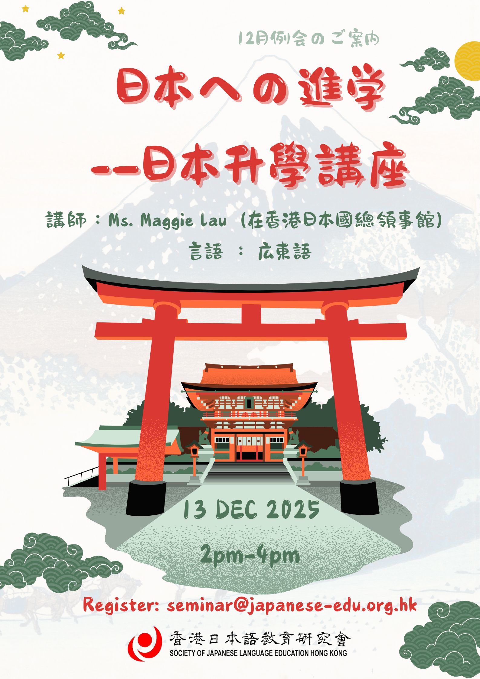日本への留学を申請するにあたり、目的によっていくつかルートがあります。今回は在香港日本国総領事館の方をお招きし、留学に関する手続きや必要な書類、香港で申請できる奨学金などの情報もご提供いただきます。さらに、今回は日本での留学経験がある方をお招きし、日本での生活の様子などについてお話しいただく予定です。そして、日本ではどのような勉強ができるのか、大学をはじめ専門学校などさまざまな専門の選択肢があります。現在の日本留学に関する情報を共有できる機会になればと思います。